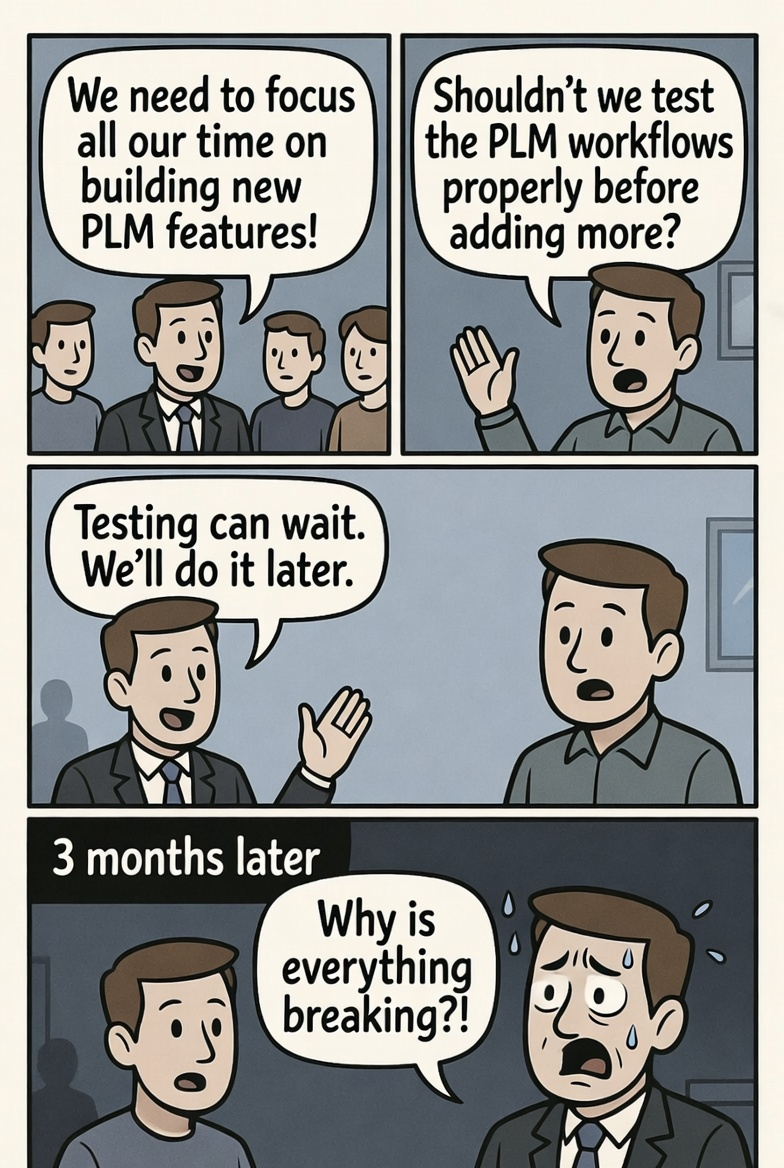 PLM systems also integrate with CAD tools, ERP systems, MES platforms, configuration systems, and supplier portals. Any change whether an upgrade, a customization, or even a small configuration adjustment can break something somewhere else. This makes manual testing extremely difficult, especially when teams try to repeat dozens or hundreds of workflows every time the system changes. Many companies simply do not have the time or resources to test everything manually, and that is when problems begin to appear in production.